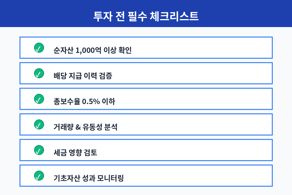 순자산 규모가 1,000억원 이상인지(상폐 위험 최소화), 과거 1년간 분배금 지급 내역이 안정적인지, 기초자산의 가격 추이가 우하향하지 않는지, 총보수율이 업계 평균 이하인지(통상 0.3~0.5%), 거래량이 충분하여 매매 시 유동성 문제가 없는지를 확인한다.